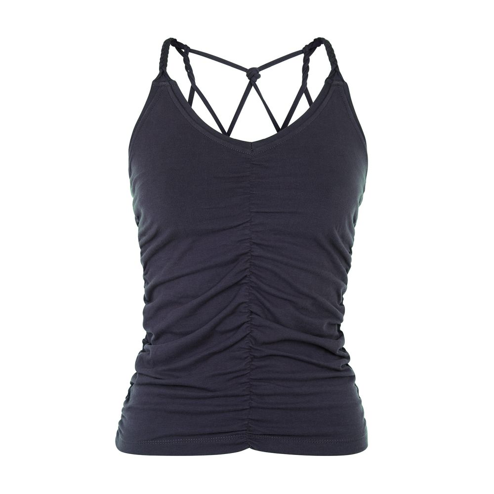 Top je jemně nařasený na přední i na zadní straně a má tenká ramínka. Ta jsou zepředu zapletena jako copánky a na zádech pak tvoří malou "pavučinu".