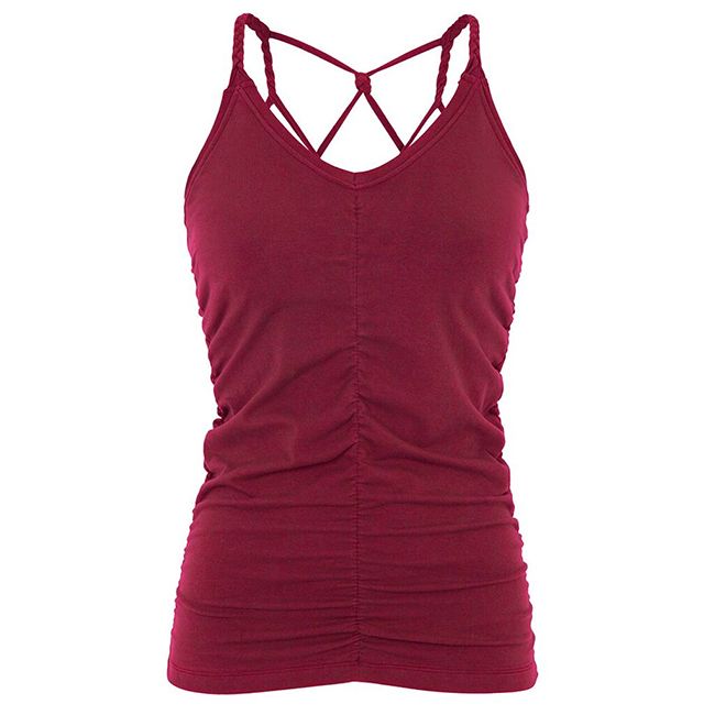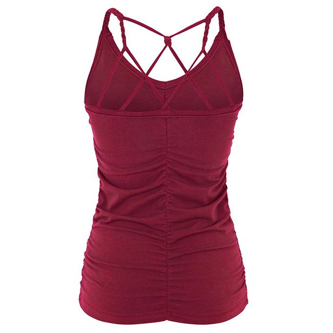 Top je jemně nařasený na přední i na zadní straně a má tenká ramínka. Ta jsou zepředu zapletena jako copánky a na zádech pak tvoří malou "pavučinu".