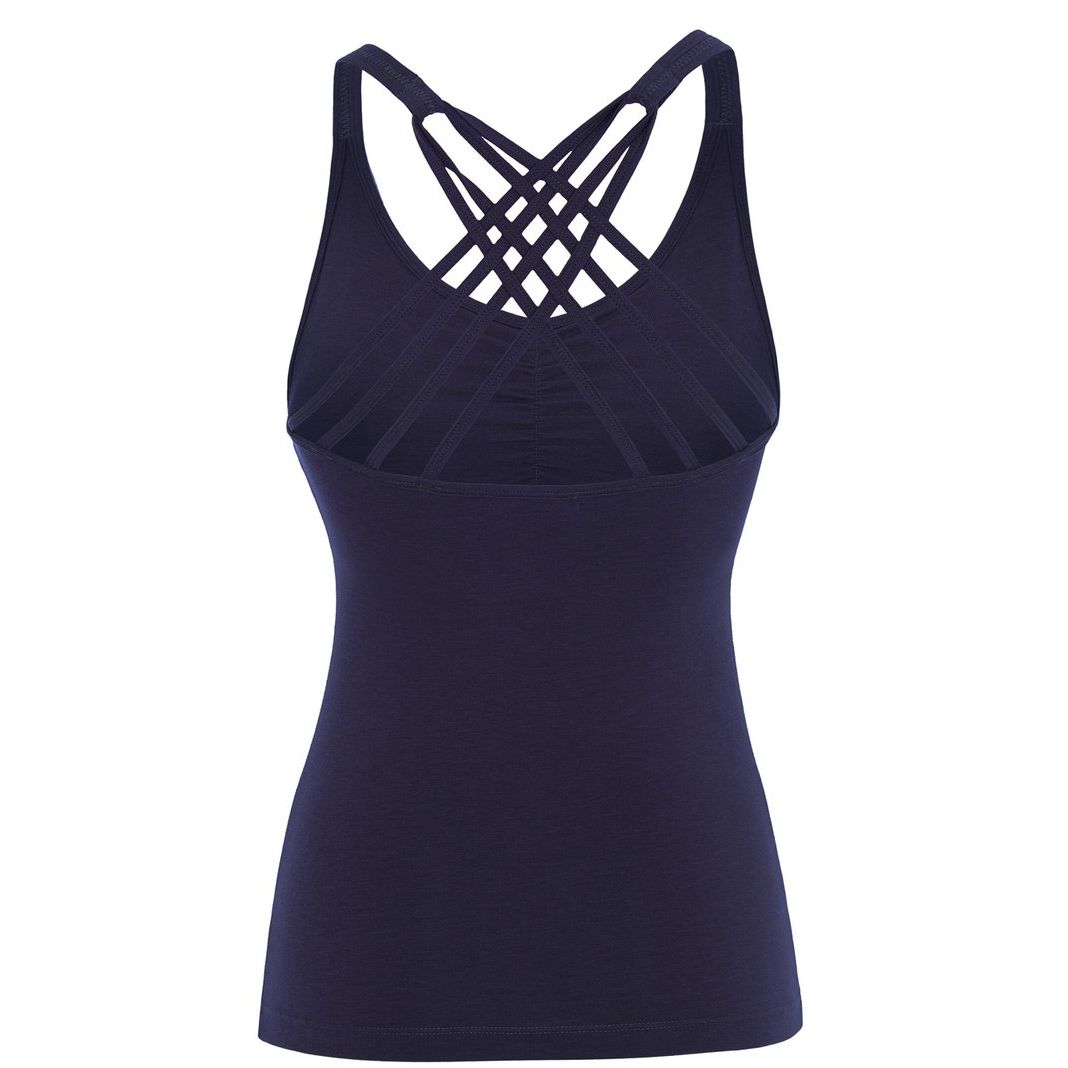 Ramínka jsou v přední části širší a velmi komfortní, v zádové oblasti je pak proužků více a jsou navzájem překřížené, propletené do efektního obrazce. Top má integrovanou podprsenku s vyjímatelnými vycpávkami.