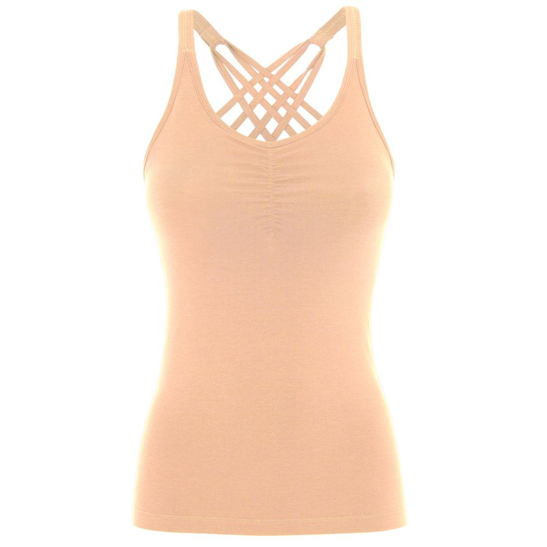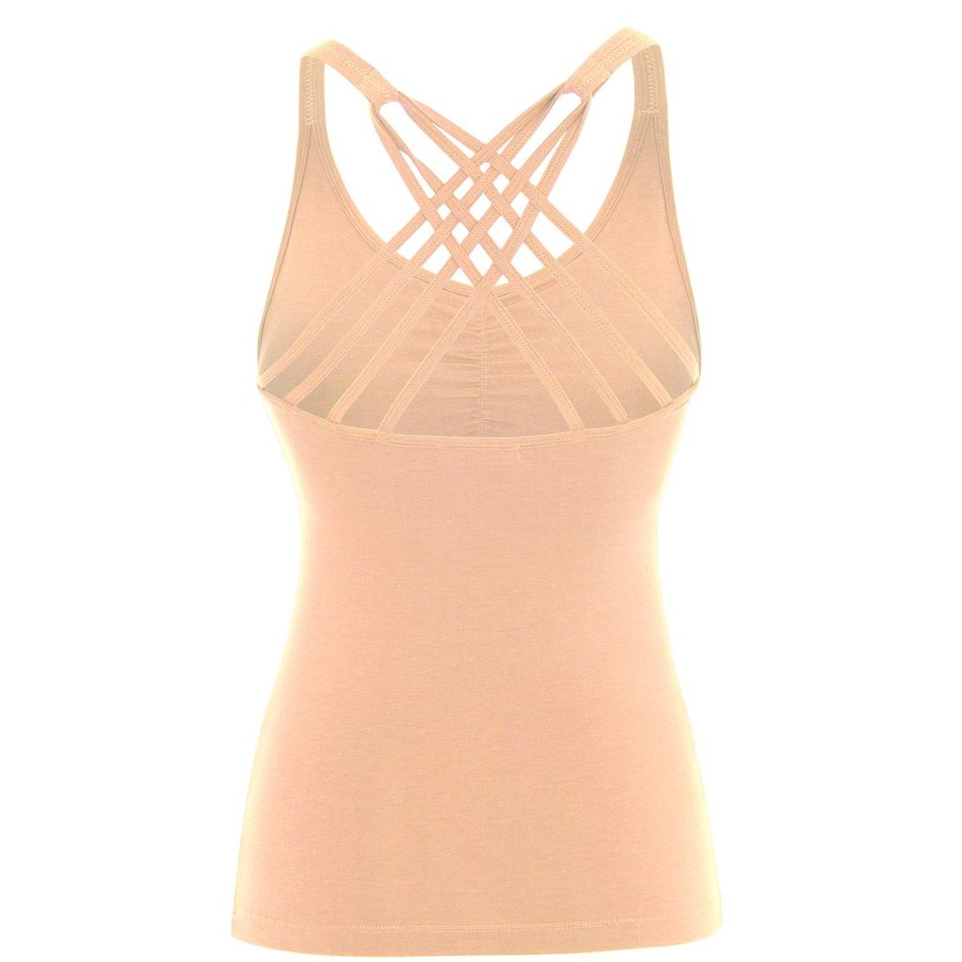Ramínka jsou v přední části širší a velmi komfortní, v zádové oblasti je pak proužků více a jsou navzájem překřížené, propletené do efektního obrazce. Top má integrovanou podprsenku s vyjímatelnými vycpávkami.