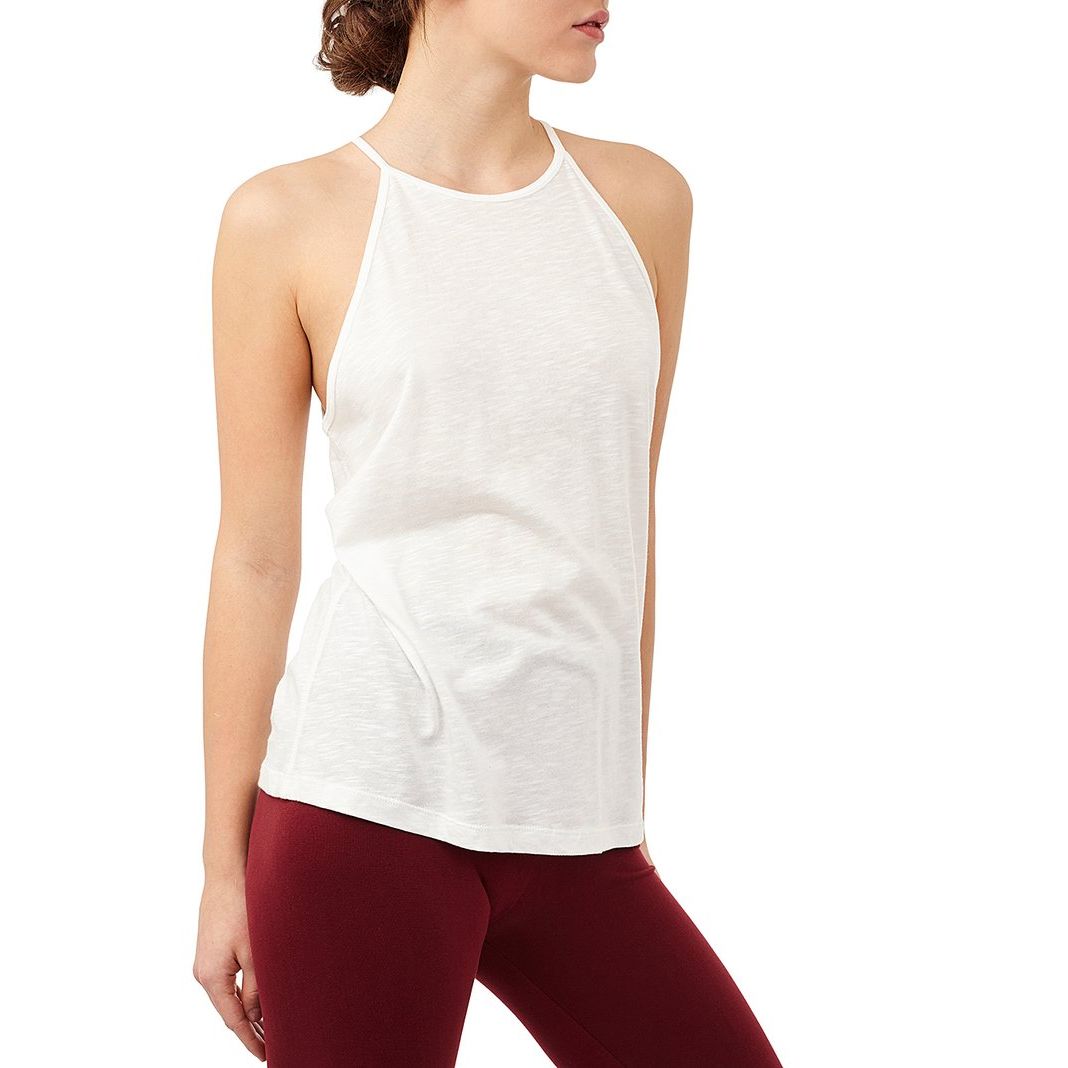 Široký yoga top s prostřihem v oblasti zad s vysoce posazenou přední částí téměř až ke krku a zároveň velmi vzdušný a volný střih, ve kterém postava působí velmi lichotivě.
