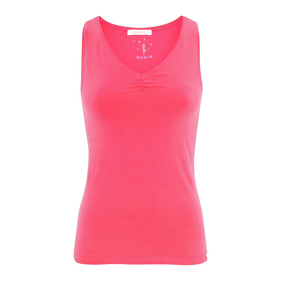 Lehce zaoblený výstřih ve tvaru písmene "V", k tomu jemné efektní nařasení, dobře padnoucí integrovaná podprsenka a šmrncovní zadní část. To je Racer Top od Mandaly.